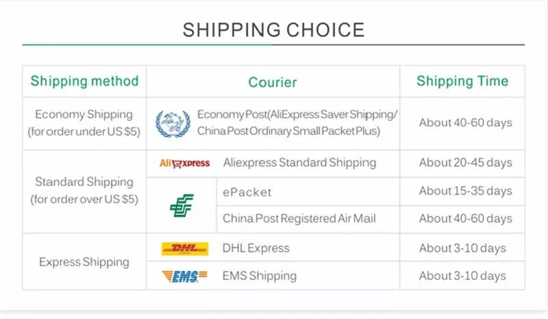 1. If you choose to ship from China, we ship by the AliExpress Standard Shipping; if you choose to ship from overseas warehouses, we will ship by the local logistics delivery.